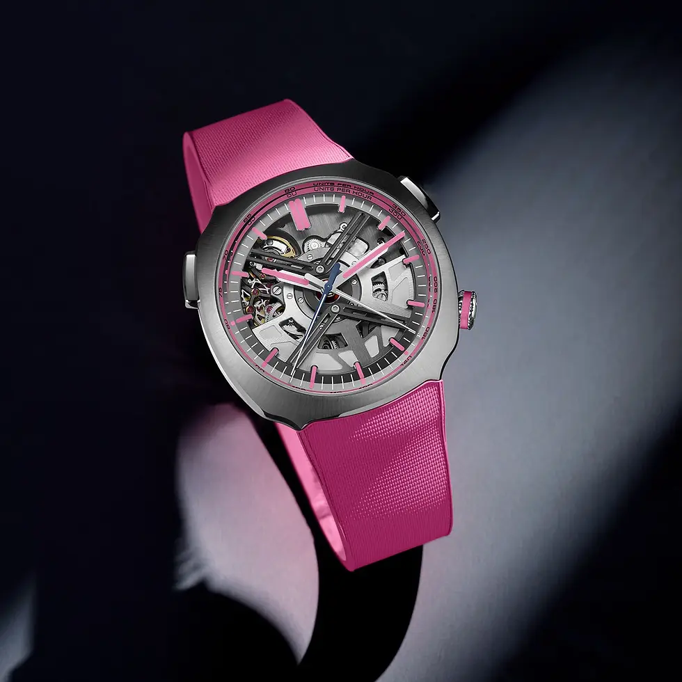 Presented as a two-watch set, it includes the Drivers Edition featuring a flyback chronograph, and the Mechanic Edition, a connected watch that integrates modern technology. Both models are defined by a bold pink aesthetic, delivering a distinctive and dynamic presence.