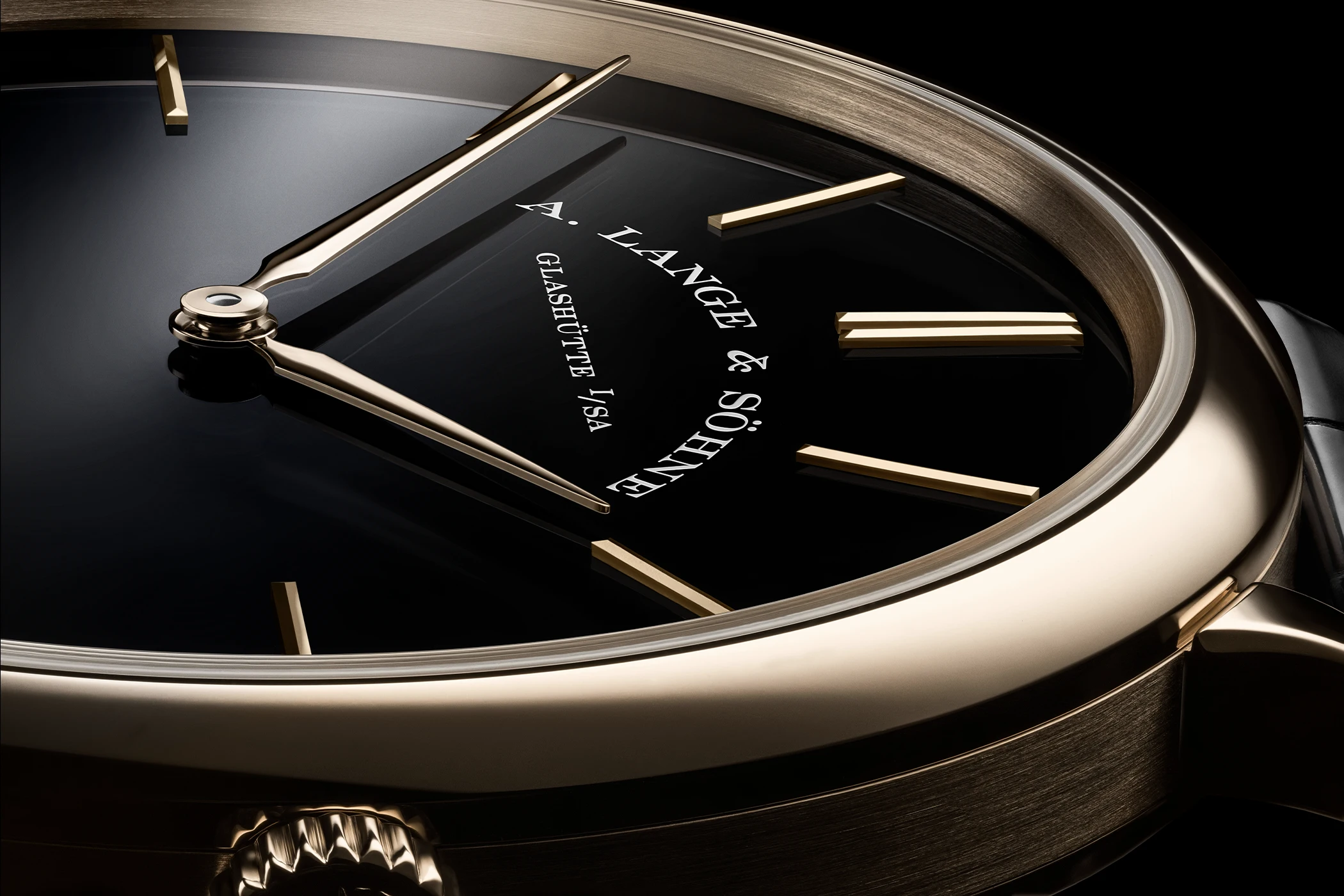 縞瑪瑙錶盤的製作極為繁複。朗格從天然石材中精選色層最均勻的部分,經過多重切割、研磨與拋光,最終呈現出如鏡面般光滑的質感。深邃的黑色在光線下散發細微的流動光澤,如同夜空的靜謐波動,展現出低調而迷人的深度。
